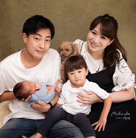 家族撮影はパパ、ママ、ご兄弟、赤ちゃんとなります。わんちゃんも抱っこでしたら家族撮影に参加出来ます。